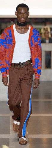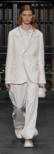 Jonathan Anderson's shows are always a blend of intricate construction and boundless creativity, presenting fashion-forward statement pieces that captivate audiences. His SS24 collection was no exception. Drawing inspiration from his playful imagination, Anderson showcased designs featuring sculptural silhouettes, a hallmark of his style. What set this collection apart was his innovative use of plasticine as a material. The debut ensemble, a grey hoodie paired with shorts, was sculpted onto the model, casting dynamic shadows and contrasts reminiscent of fluid apparel. This was followed by designs in vibrant tangerine/silver and midnight blue. The subsequent pieces evoked the essence of high-fashion DIY, with cargo pants billowing at the ankles and bomber jackets enlarged to dramatic proportions, adorned with feathers ready to burst. Padded vinyl ensembles seemed to dance like wind-filled balloons, displayed in vivid shades of yellow, orange, and cerulean. Anderson's line also featured decadent dresses, draped and knotted asymmetrically. And, making its anticipated return, the Bumper Bag was unveiled in a range of hues, accompanied by the season's trending accessory, the knitted moccasin.
