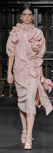 Simone Rocha's SS24 collection at the Mulryan Centre for Dance evoked the ethereal ambiance of a wedding, but intriguingly, sans the bride and groom. Aptly titled 'Dress Rehearsal,' the show was a theatrical portrayal of emotions swirling before matrimony. Models adorned in delicate hues and contrasting blacks meandered around a chapel-like white wooden structure. The collection's focal elements were unmistakably roses, sheer fabrics, and ribbons. A standout pink nylon ensemble was adorned with a cascade of roses, trailing ribbons in its wake. This was quickly followed by a diaphanous piece, under which bouquets of roses were subtly sewn. Drawing direct inspiration from weddings, some designs featured long white gowns reminiscent of wedding cake tiers, paired intriguingly with cake-bag accessories. The collection took a dramatic turn with lace-trimmed motorbike jackets and pearl-embellished suits. Yet, what truly made waves online was Rocha's unexpected alliance with Crocs, resulting in a pearl-encrusted rendition of the famed utilitarian footwear.
